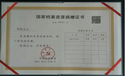 2021年12月20日桂林市周畅先生向省档案馆捐赠了《嘉木中国》1册(证书编号000015)