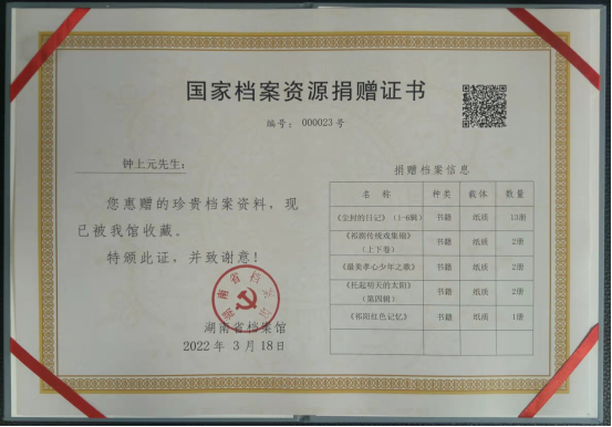 2022年3月18日祁阳市关工委主任钟上元向省档案馆捐赠《尘封的日记》《祁剧传统戏集锦》《最美孝心少年之歌》《托起明天的太阳》《祁阳红色记忆》共20册(证书编号000023)