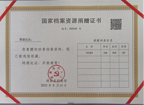 2023年8月14日覃盟先生向省档案馆捐赠《红烛》书籍2册(证书编号000048)