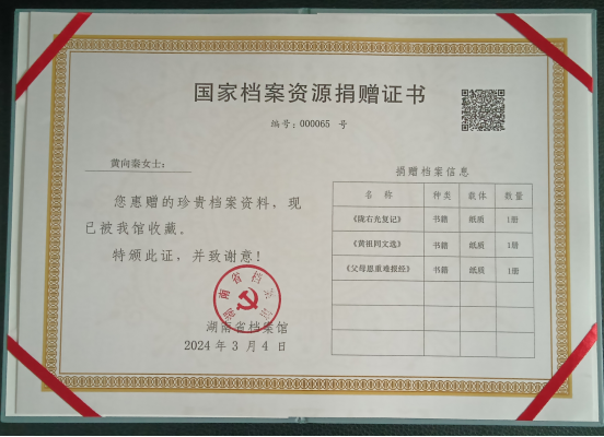 图为湖南省档案馆给黄向秦女士颁发捐赠证书