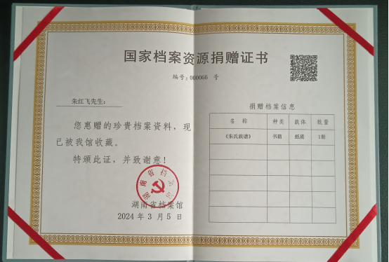2024年3月5日朱红飞先生向省档案馆捐赠《朱氏族谱》1册(证书编号000066)