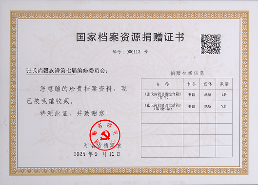 2025年9月12日张氏尚穀族谱第七届编修委员会向湖南省档案馆捐赠《张氏尚穀总谱综合篇》《张氏尚穀总谱世系篇》等书籍共10册(证书编号000113)