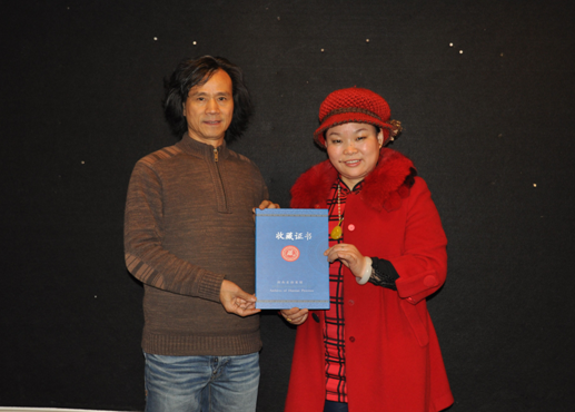 (知名文艺家项目组负责人(右)为著名书法家陈羲明先生(左)颁发收藏证书 陈艺 摄)