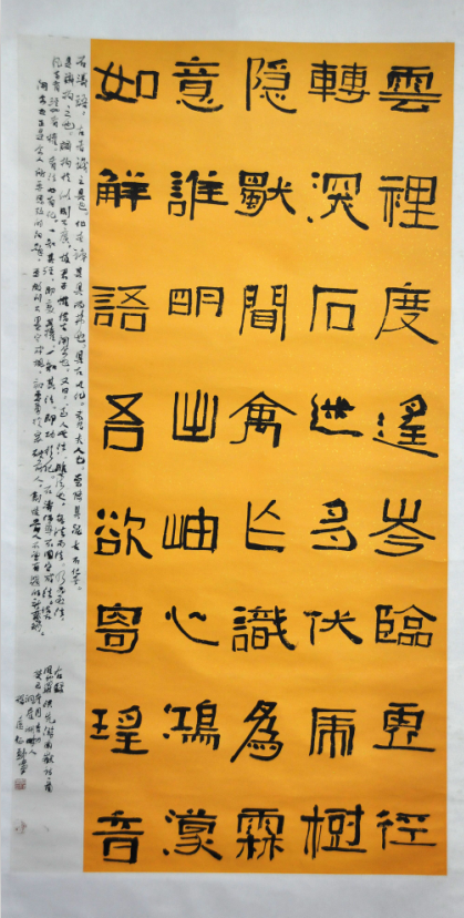 杨老师此次移交的作品中有气势宏阔尺幅巨大的楹联立轴“花雨晴天落,松风终日来”的大字榜书行草,运笔气势雄浑,章法简约而扑拙,行笔酣畅而伸缩有致,特别是大小错落有致而独标风韵。大幅隶书作品“罗洪先游南岳诗一首”再加上“石涛语录”行草书的提跋,一动一静,疏密有致,富有空间节奏感,极富审美情趣。