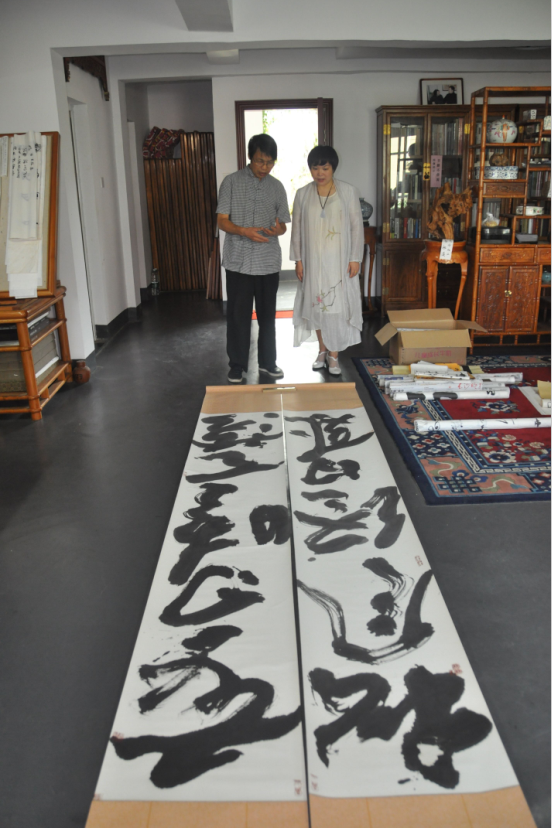 杨远征先生(左)向湖南知名文艺家项目组负责人徐军(右)展示讲解作品