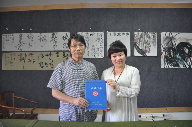 湖南知名文艺家项目组负责人徐军(右)为知名书法家杨远征先生(左)颁发收藏证书