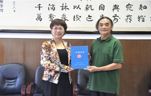 湖南省档案局副局长薛冬英(左)为全国著名花鸟画家柯桐枝先生颁发收藏证书