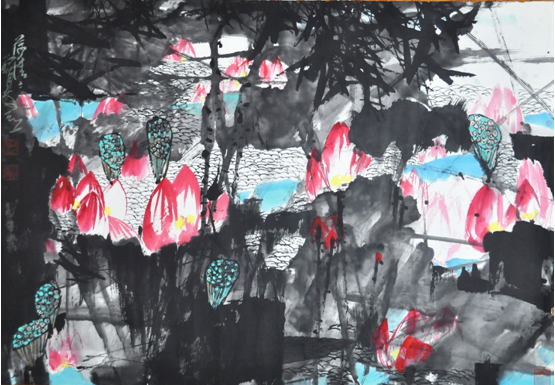 柯桐枝先生把他最满意的大幅力作《不尽春光》(179cmX97cm)及《荷清清》(140cmX97cm)交给省档案馆保藏。看着柯桐枝的花鸟画,迎面而来折射眼帘的便是夺目绚丽的色彩,万紫千红,照眼惊心,想不热闹都不行,因为,一开一大片,平铺过去是花的海洋,悬挂下来是花的瀑布。他的花鸟画是从亚热带和雨林中带回来的,自然、旺盛、阳光、雨露造就了生灵的热闹。