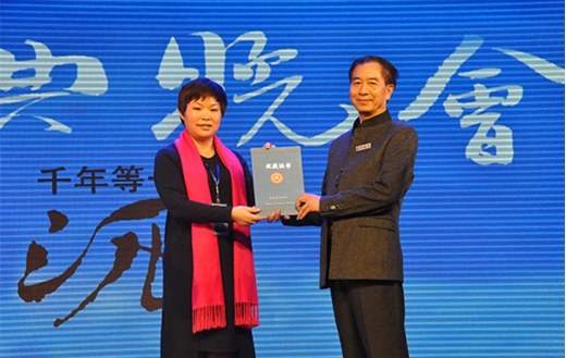 知名文艺家项目组负责人徐军(左)为潇湘画院研究院院长唐思源先生(右)颁发收藏证书