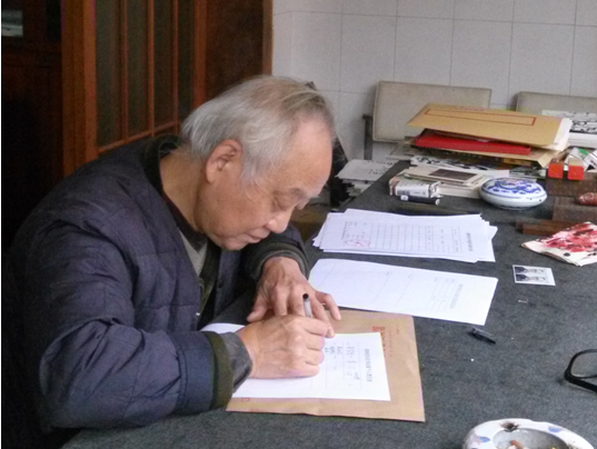 (图为黄苏民先生在认真填写《湖南省知名书法家作品移交文据》 徐军 摄)