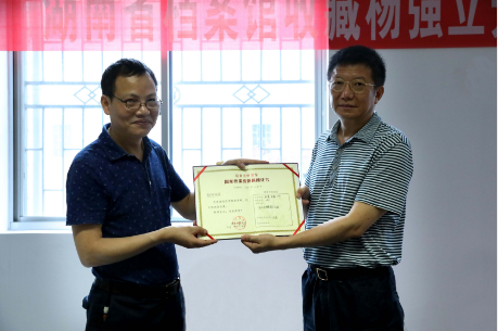 省档案馆党组成员、副馆长罗碧野(右)为杨强立先生颁发收藏证书