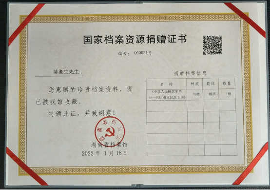 2022年1月18日浙江省杭州市陈湘生先生向省档案馆捐赠了《中国人民解放军第廿一兵团成立纪念专刊》1册(证书编号000021)